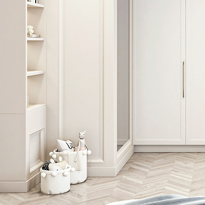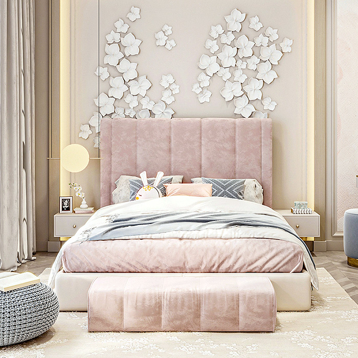Находиться в пастельном интерьере легко и спокойно. Спальня выглядит изящно и нежно с кроватью и мягкой обивкой. Высокая спинка создает ощущение комфорта, а текстиль — уюта. Отличным дополнением такого дизайна стал туалетный столик, который можно использовать для декора или личных вещей.